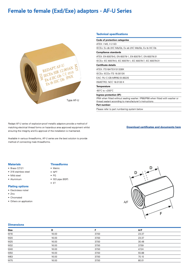 Eaton Crouse-Hinds series Redapt (Exd/Exe) adaptors - AF-U Series ATEX IECEx CSA CE 认证防爆内丝接头