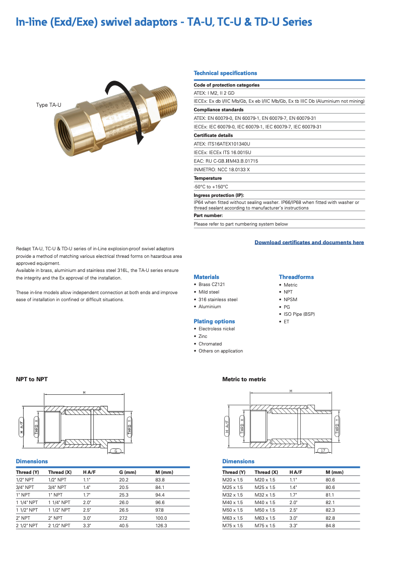 Eaton Crouse-Hinds series Redapt In-line (Exd/Exe) swivel adaptors - TA-U Series ATEX IECEx EAC CE 认证防爆接头 TAU100404 |