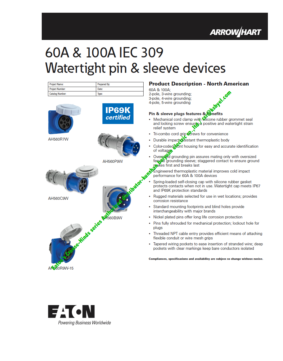 Eaton Arrow Hart pin and sleeve connector, IP69K Rated,60A