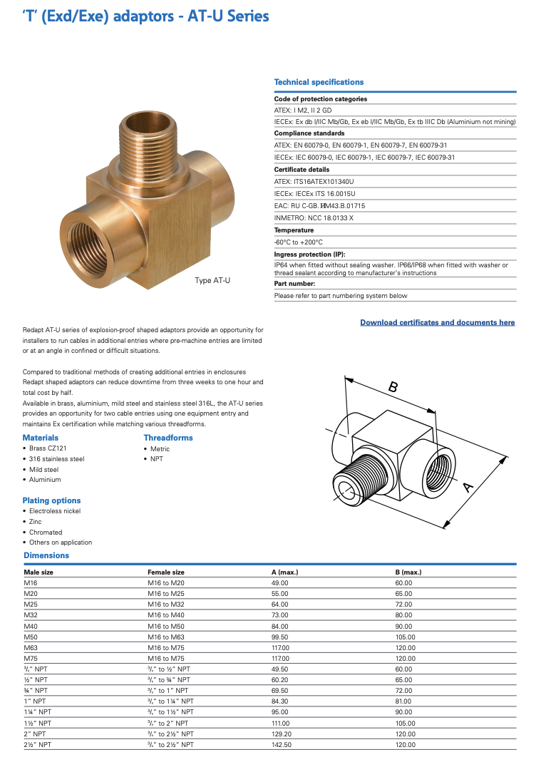 Eaton Crouse-Hinds series Redapt T (Exd/Exe) adaptors - AT-U SeriesATEX IECEx CSA CE 认证防爆T型接头