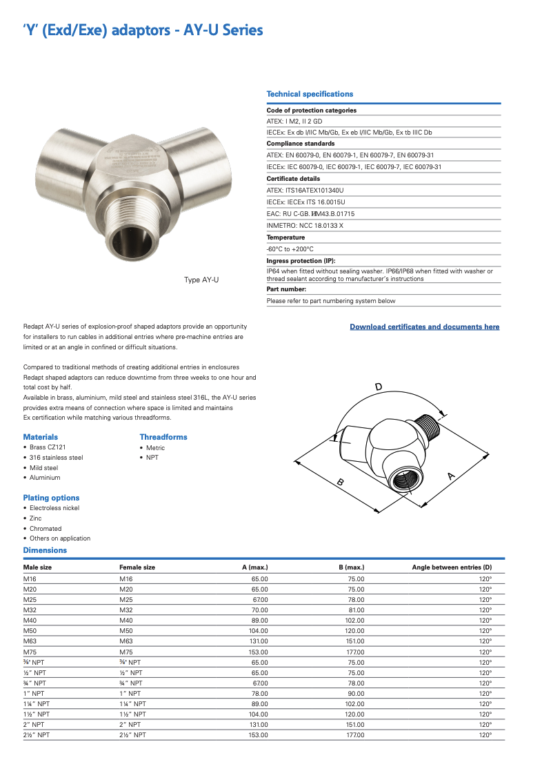 Eaton Crouse-Hinds series Redapt ‘Y’ (Exd/Exe) adaptors - AY-U Series ATEX IECEx CSA CE 认证防爆Y型接头